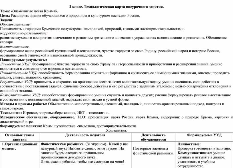 Методическое обеспечение, оборудование, ТСО: презентация, карта России, карта Крыма, видеоролик о природе Крыма, карточки к дидактической игре.