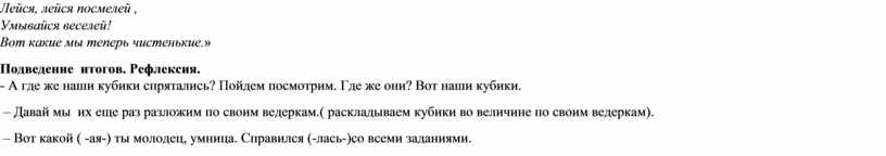 – А теперь побежим к водичке, и покажем ей, какие у нас грязные пальчики- ( идем мыть ручки), проговаривая потешку: « Знаем, знаем ,да, да, да, где ты прячешься вода! Выходи водица! Мы пришли умыться! Лейся, на ладошку, по-нем- нож-ку, Лейся, лейся посмелей , Умывайся веселей! Вот какие мы теперь чистенькие.»