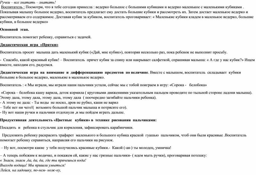 Воспитатель : Посмотри, что я тебе сегодня принесла : ведерко большое с большими кубиками и ведерко маленькое с маленькими кубиками . Показывая малышу большое ведерко, воспитатель предлагает ему достать большие кубики и рассмотреть их. Затем достает маленькое ведерко и рассматриваем его содержимое. Доставая кубик за кубиком, воспитатель проговаривает: « Маленькие кубики кладем в маленькое ведерко, большие кубики, в большое ведерко»