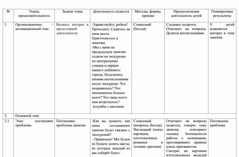Технологическая карта занятия по оригами