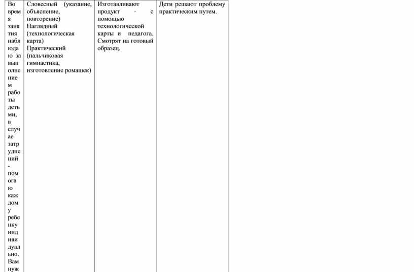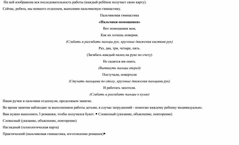 Словесный (указание, объяснение, повторение) Наглядный (технологическая карта) Практический (пальчиковая гимнастика, изготовление ромашек) |