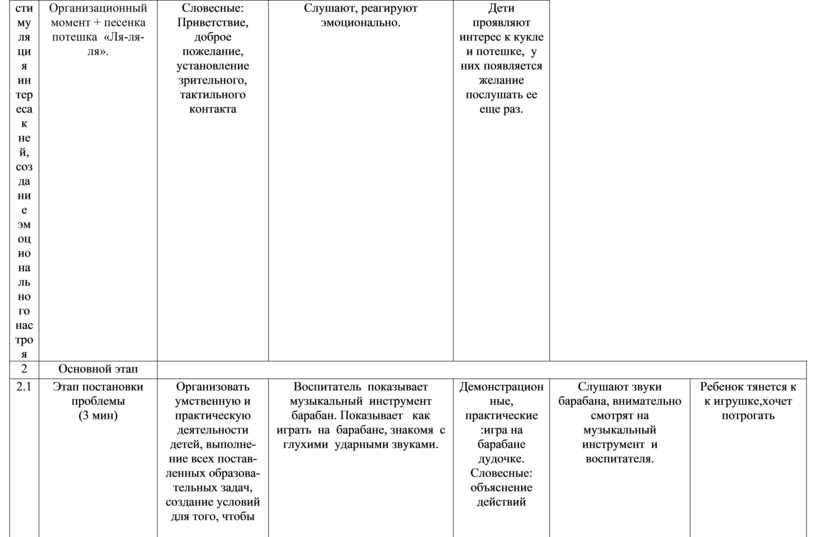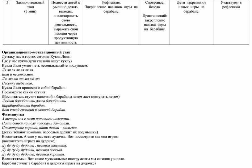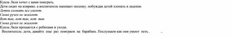 Подготовительная работа: составление конспекта, показ куклы, музыкальных инструментов .