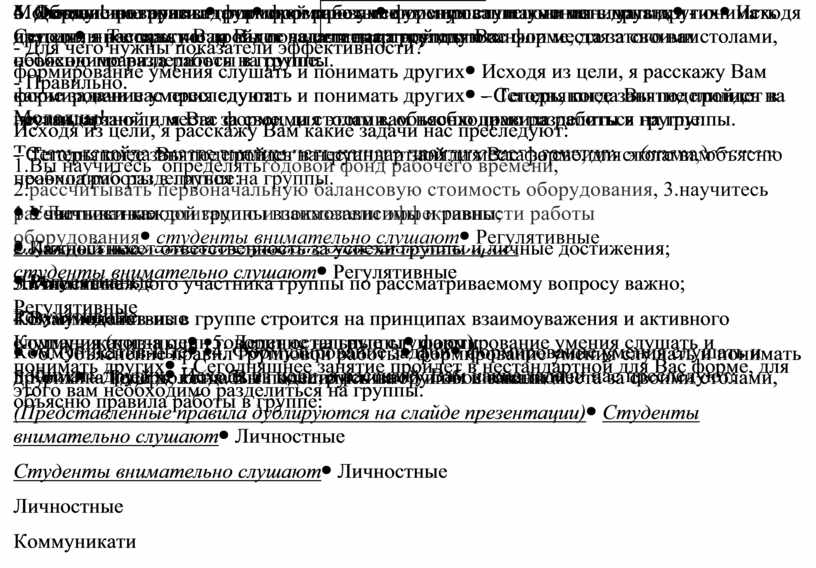 – Теперь, когда Вы поделились на группы и заняли места за своими столами, объясню правила работы в группе: 1.Участники каждой группы взаимозависимы и равны; 2.Каждый несет ответственность за успехи группы и личные достижения; 3.Мнение каждого участника группы по рассматриваемому вопросу важно; 4.Взаимодействие в группе строится на принципах взаимоуважения и активного слушания (когда один говорит остальные слушают); 5.Критика идей должна быть конструктивной и обоснованной. (Представленные правила дублируются на слайде презентации) |