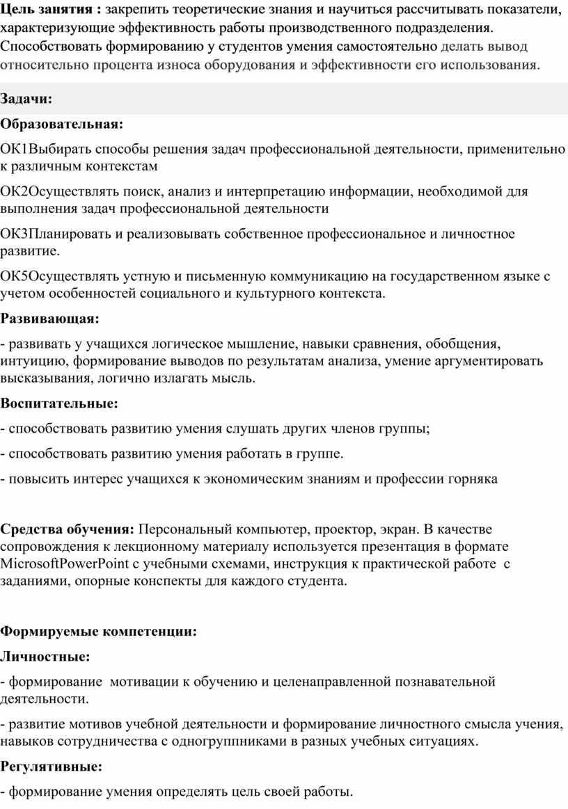 Цель занятия : закрепить теоретические знания и научиться рассчитывать показатели, характеризующие эффективность работы производственного подразделения. Способствовать формированию у студентов умения самостоятельно делать вывод относительно процента износа оборудования и эффективности его использования.