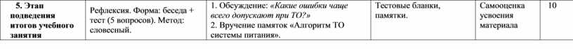 Рефлексия. Форма: беседа + тест (5 вопросов). Метод: словесный. |
