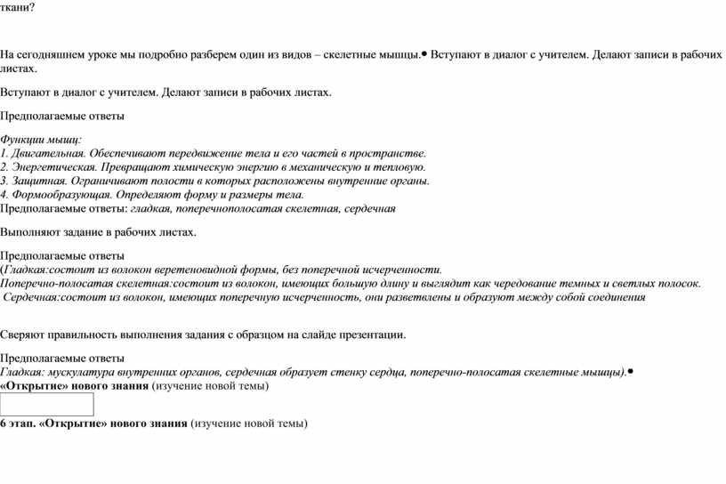 Вступают в диалог с учителем. Делают записи в рабочих листах. Предполагаемые ответы Функции мышц: 1. Двигательная. Обеспечивают передвижение тела и его частей в пространстве. 2. Энергетическая. Превращают химическую энергию в механическую и тепловую. 3. Защитная. Ограничивают полости в которых расположены внутренние органы. 4. Формообразующая. Определяют форму и размеры тела. Предполагаемые ответы: гладкая, поперечнополосатая скелетная, сердечная Выполняют задание в рабочих листах. Предполагаемые ответы (Гладкая:состоит из волокон веретеновидной формы, без поперечной исчерченности. Поперечно-полосатая скелетная:состоит из волокон, имеющих большую длину и выглядит как чередование темных и светлых полосок. Сердечная:состоит из волокон, имеющих поперечную исчерченность, они разветвлены и образуют между собой соединения
