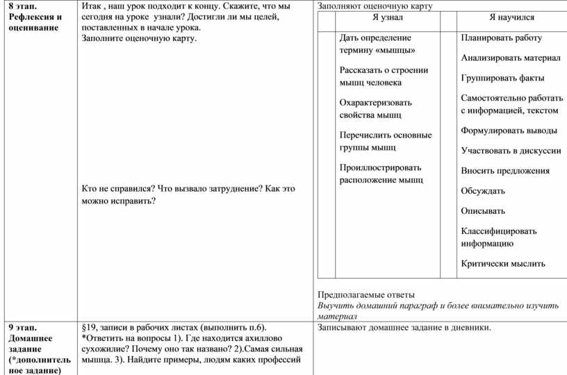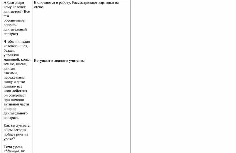 Общий итог этапа мотивации – формулирование учащимися предполагаемой темы урока: «Мышцы, их строение и функции». У вас на столах лежат рабочие листы. В течение всего урока вы будете вносить в них записи и результаты работы, запишите тему урока. |