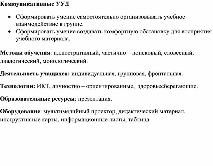 Оборудование: мультимедийный проектор, дидактический материал, инструктивные карты, информационные листы, таблица.