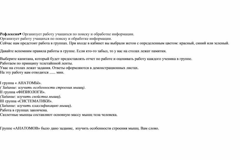 Организует работу учащихся по поиску и обработке информации. Сейчас нам предстоит работа в группах. При входе в кабинет вы выбрали жетон с определенным цветом: красный, синий или зеленый. Давайте вспомним правила работы в группе. Если кто-то забыл, то у вас на столах лежат памятки. Выберите капитана, который будет предоставлять отчет по работе и оценивать работу каждого ученика в группе. Работаем по принципу телетайпной ленты. Увас на столах лежат задания. Ответы оформляются в демонстрационных листах. На эту работу вам отводится ...... мин.