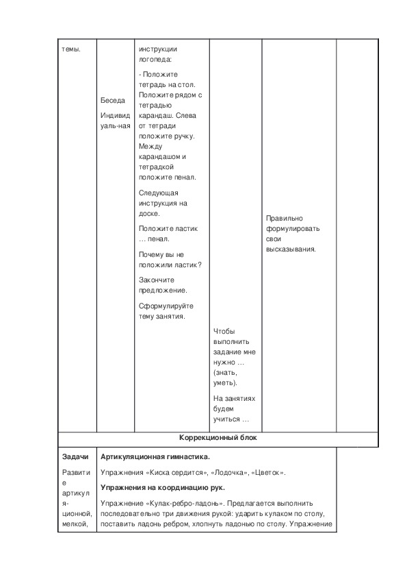 Коррекционно-развивающие. Совершенствовать навык построения связного высказывания. Развивать анализ, оценку продуктивности своей деятельности. Развивать психологические предпосылки к обучению: устойчивости внимания, наблюдательности, способности к переключению, способности к запоминанию. Развитее и уточнение пространственных представлений.