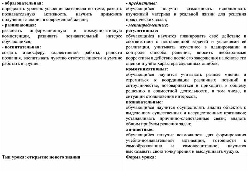 - предметные: обучающийся получит возможность использовать изученный материал в реальной жизни для решения практических задач; - метапредметные: регулятивные: обучающийся научится планировать своё действие в соответствии с поставленной задачей и условиями её реализации, учитывать изученное в планировании и контроле способа решения, вносить необходимые коррективы в действие после его завершения на основе его оценки и учёта характера сделанных ошибок; коммуникативные: обучающийся научится учитывать разные мнения и стремиться к координации различных позиций в сотрудничестве, договариваться и приходить к общему решению в совместной деятельности, в том числе, в ситуации столкновения интересов; познавательные: обучающийся научится осуществлять анализ объектов с выделением существенных и несущественных признаков; устанавливать причинно-следственные связи; владеть общим приёмом решения задач; личностные: обучающийся получит возможность для формирования учебно-познавательной мотивации, готовности к самообразованию и самовоспитанию; научится высказывать свою точку зрения и выслушивать чужую. |