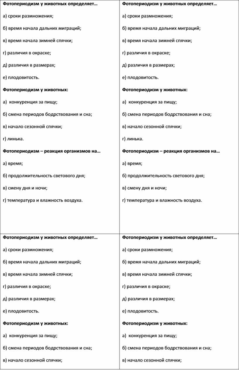 Фотопериодизм у животных определяет… а) сроки размножения; б) время начала дальних миграций; в) время начала зимней спячки; г) различия в окраске; д) различия в размерах; е) плодовитость. Фотопериодизм у животных: а) конкуренция за пищу; б) смена периодов бодрствования и сна; в) начало сезонной спячки; г) линька. Фотопериодизм – реакция организмов на… а) время; б) продолжительность светового дня; в) смену дня и ночи; г) температура и влажность воздуха.