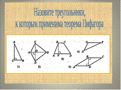Организует фронтальную работу: • Cформулируйте теорему Пифагора? • К любым ли треугольникам ее можно применить? • Обратите внимание на слайд: назовите треугольники, к которым применима теорема Пифагора. Слайд 3.