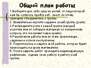 Работа над квестом займет у вас два урока. На первом уроке Вам необходимо разделиться на группы (по 5 человек), выбрать роль, познакомиться с ролевыми заданиями. Слайд 10.