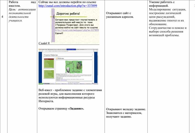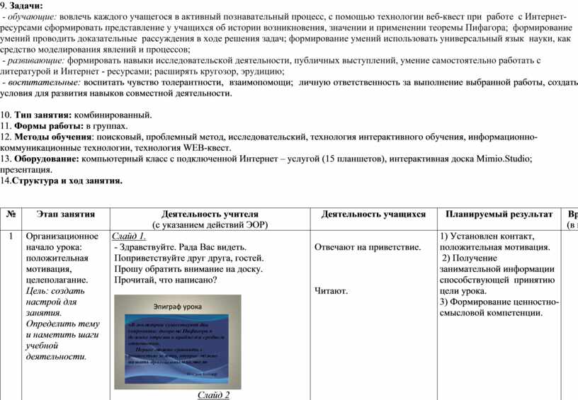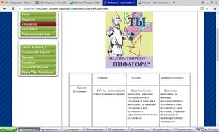 8. Цель занятия: с помощью технологии WEB-квест в процессе работы с Интернет-ресурсами сформировать представление у учащихся об истории возникновения, значении и применении теоремы Пифагора. Стимулировать учащихся на совместное творчество через работу в команде.