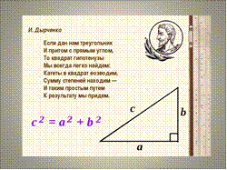 · Существуют стихи, позволяющие лучше запомнить формулировку теоремы, например, такое стихотворение И. Дырченко Слайд 4.
