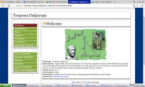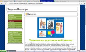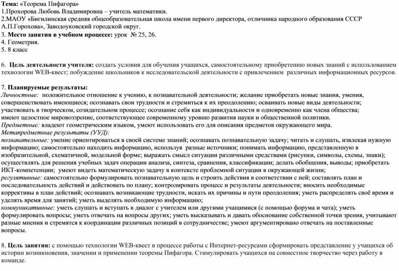 - обучающие: вовлечь каждого учащегося в активный познавательный процесс, с помощью технологии веб-квест при работе с Интернет-ресурсами сформировать представление у учащихся об истории возникновения, значении и применении теоремы Пифагора; формирование умений проводить доказательные рассуждения в ходе решения задач; формирование умений использовать универсальный язык науки, как средство моделирования явлений и процессов;