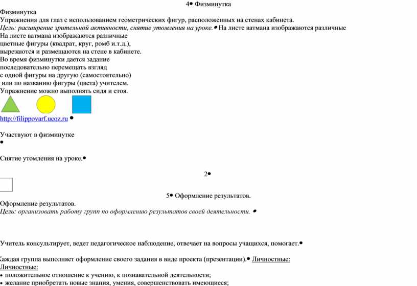 Физминутка Упражнения для глаз с использованием геометрических фигур, расположенных на стенах кабинета. Цель: расширение зрительной активности, снятие утомления на уроке. |
