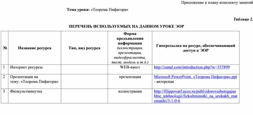 ПЕРЕЧЕНЬ ИСПОЛЬЗУЕМЫХ НА ДАННОМ УРОКЕ ЭОР