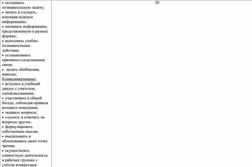 Личностные: · способность к самооценке своих действий; Регулятивные: · умение осуществлять самоконтроль; · уметь осуществлять собственную самооценку по предложенным критериям; Познавательные: · осознавать познавательную задачу; · читать и слушать, извлекая нужную информацию; · понимать информацию, представленную в разных формах; · выполнять учебно-познавательные действия; · устанавливать причинно-следственные связи; · делать обобщения, выводы; Коммуникативные: · вступать в учебный диалог с учителем, одноклассниками; · участвовать в общей беседе, соблюдая правила речевого поведения; · задавать вопросы; · слушать и отвечать на вопросы других; · формулировать собственные мысли; · высказывать и обосновывать свою точку зрения; · осуществлять совместную деятельность в рабочих группах с учётом конкретных учебно-познавательных задач.
