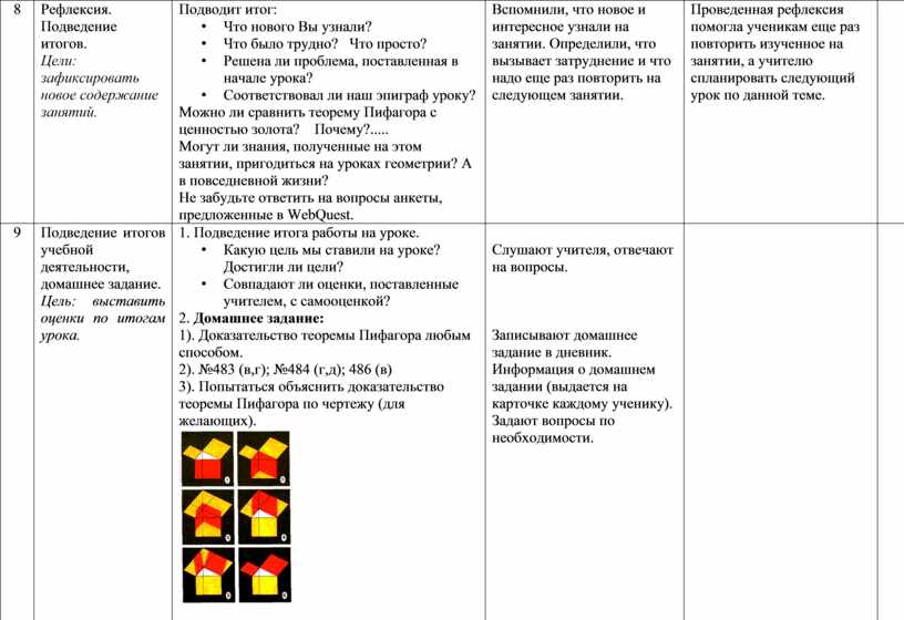 1. Подведение итога работы на уроке. • Какую цель мы ставили на уроке? Достигли ли цели? • Совпадают ли оценки, поставленные учителем, с самооценкой? 2. Домашнее задание: 1). Доказательство теоремы Пифагора любым способом. 2). №483 (в,г); №484 (г,д); 486 (в) 3). Попытаться объяснить доказательство теоремы Пифагора по чертежу (для желающих).