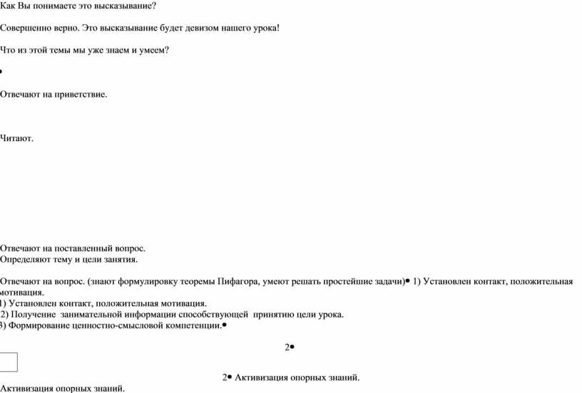 1) Установлен контакт, положительная мотивация. 2) Получение занимательной информации способствующей принятию цели урока. 3) Формирование ценностно-смысловой компетенции. |