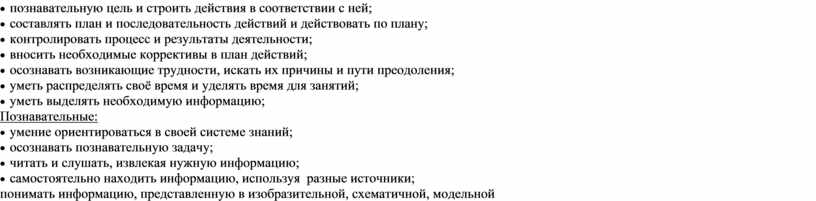 регулятивные: самостоятельно формулировать познавательную цель и строить действия в соответствии с ней; составлять план и последовательность действий и действовать по плану; контролировать процесс и результаты деятельности; вносить необходимые коррективы в план действий; осознавать возникающие трудности, искать их причины и пути преодоления; уметь распределять своё время и уделять время для занятий; уметь выделять необходимую информацию;