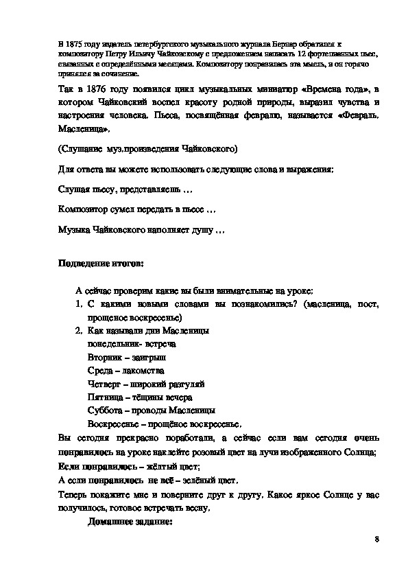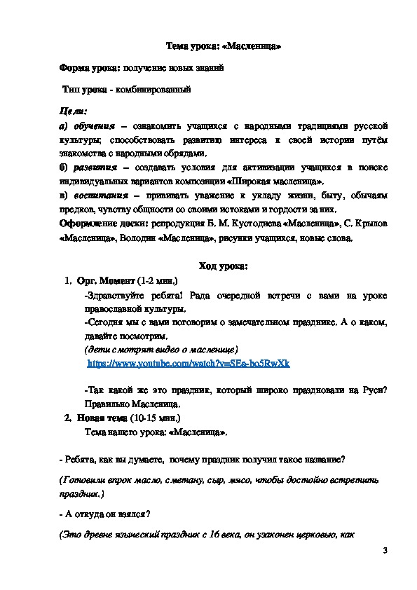 б) развития – создавать условия для активизации учащихся в поиске индивидуальных вариантов композиции «Широкая масленица».