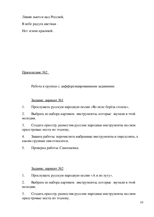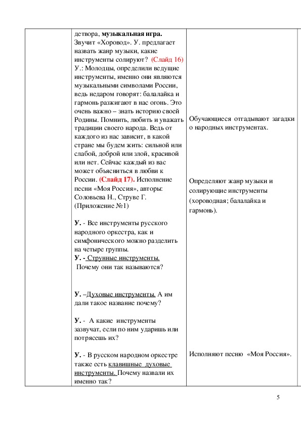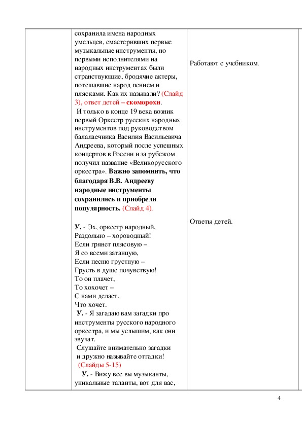 знания, делать необходимые выводы об особенностях оркестра русских