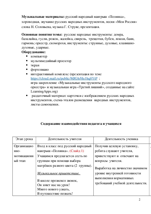 Цель урока: организовать деятельность учащихся, направленную на расширение музыкальных интересов путём знакомства с оркестром русских народных инструментов.