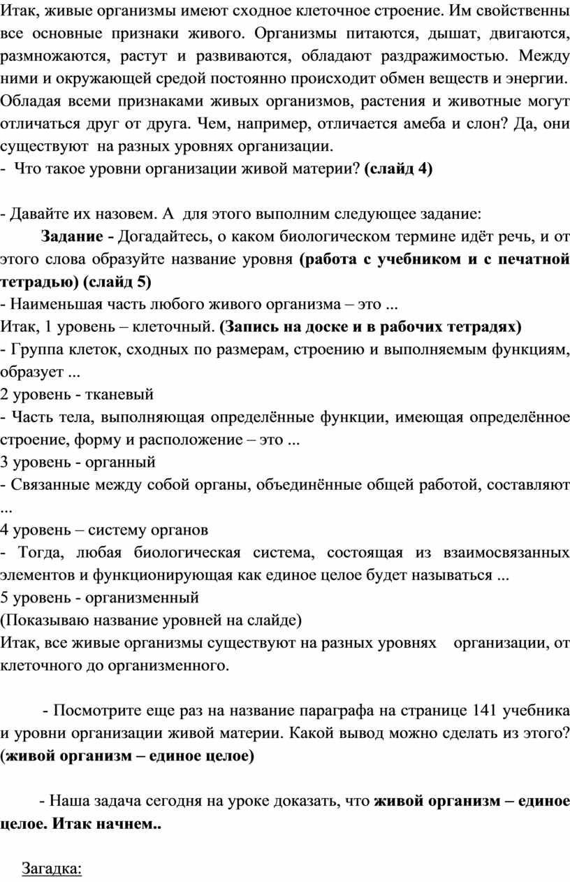- Посмотрите еще раз на название параграфа на странице 141 учебника и уровни организации живой материи. Какой вывод можно сделать из этого? (живой организм – единое целое)