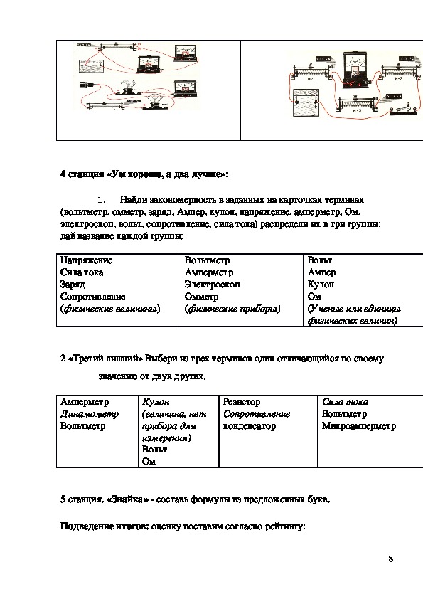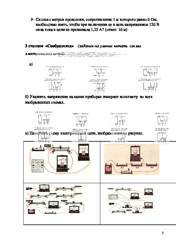 сборки электрической цепи, дифференцированные карточки задания в 4 вариантах,