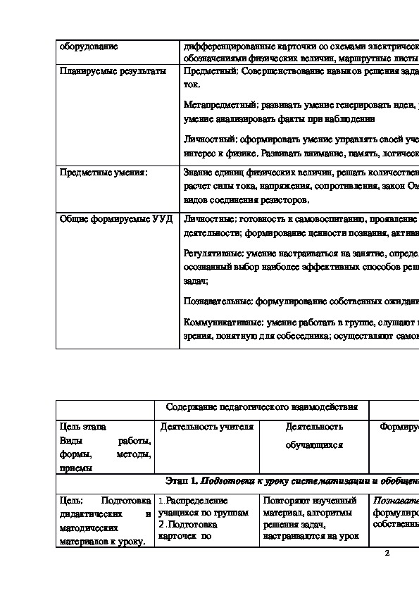 Технологическая карта урока "Решение задач по теме «Постоянный электрический ток»" 8 класс.Технологическая карта урока Решение задач по теме «Постоянный электрический ток»