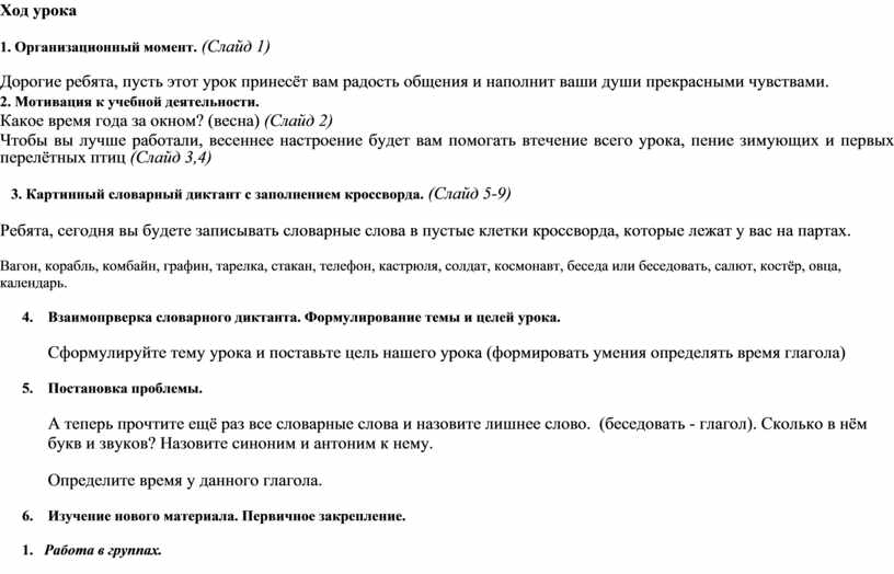 На 2 этапе для актуализация учебного содержания, необходимого для восприятия нового материала дала задание на заполнение кроссворда словарными словами и установление «лишнего слова» и предложила самим обучающимся назвать тему и цель нашего урока. На данном материале зафиксировали знания о глаголе, на которых основывается обяснение нового материала. Здесь же было предложено задание на фиксирование индивидуального затруднения в деятельности при выполнении задания на определение времени у глагола.