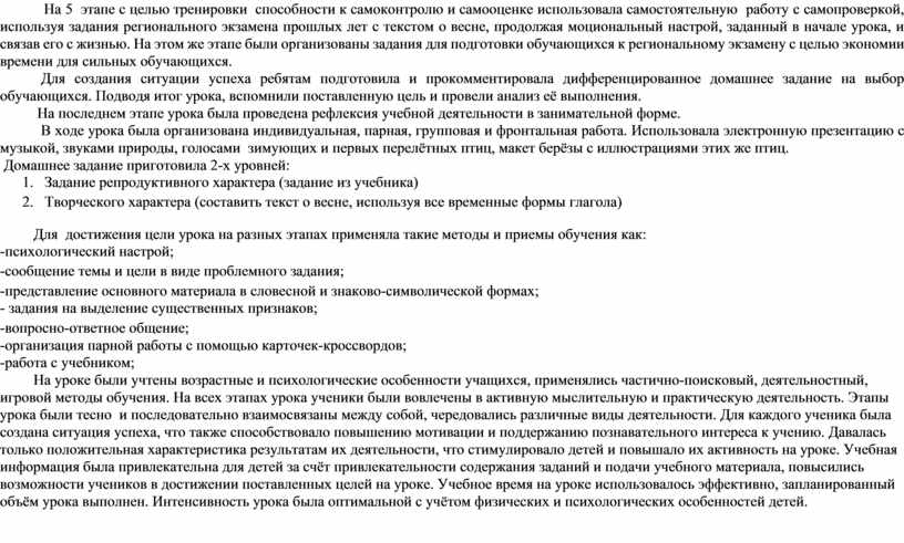 На 5 этапе с целью тренировки способности к самоконтролю и самооценке использовала самостоятельную работу с самопроверкой, используя задания регионального экзамена прошлых лет с текстом о весне, продолжая моциональный настрой, заданный в начале урока, и связав его с жизнью. На этом же этапе были организованы задания для подготовки обучающихся к региональному экзамену с целью экономии времени для сильных обучающихся.