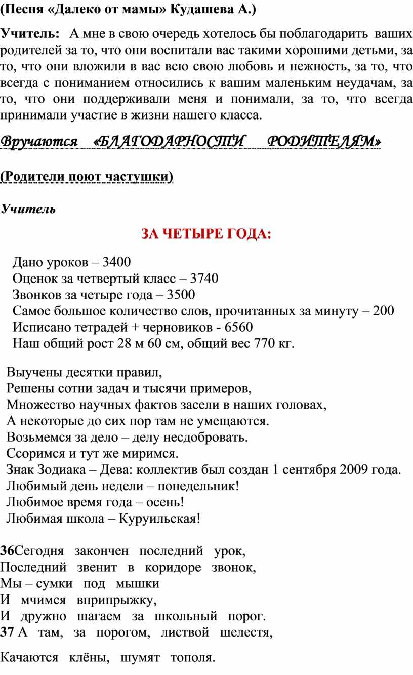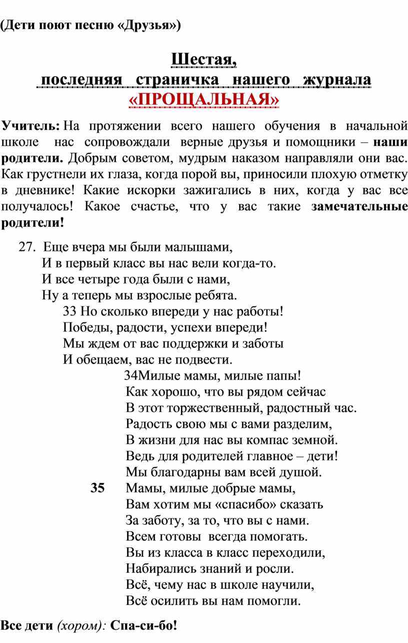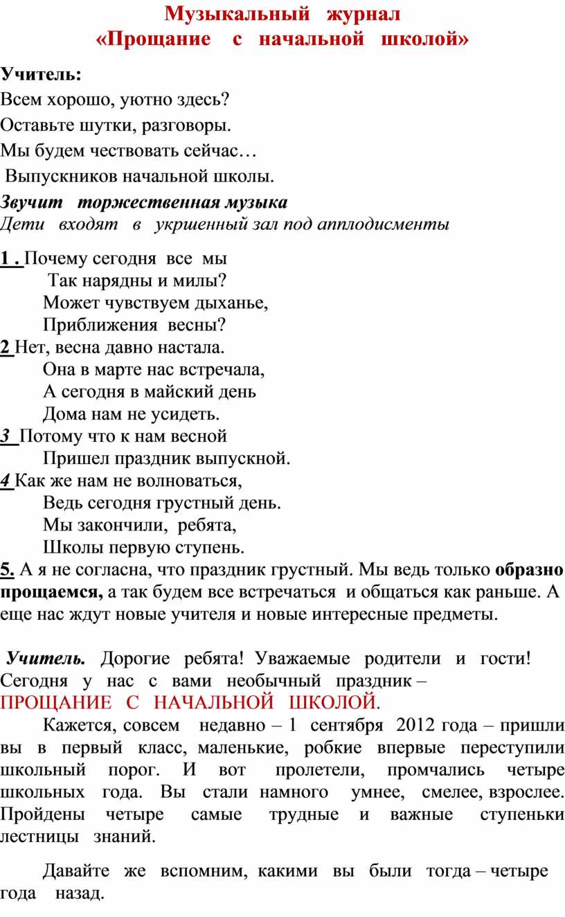 Учитель. Дорогие ребята! Уважаемые родители и гости! Сегодня у нас с вами необычный праздник – ПРОЩАНИЕ С НАЧАЛЬНОЙ ШКОЛОЙ.