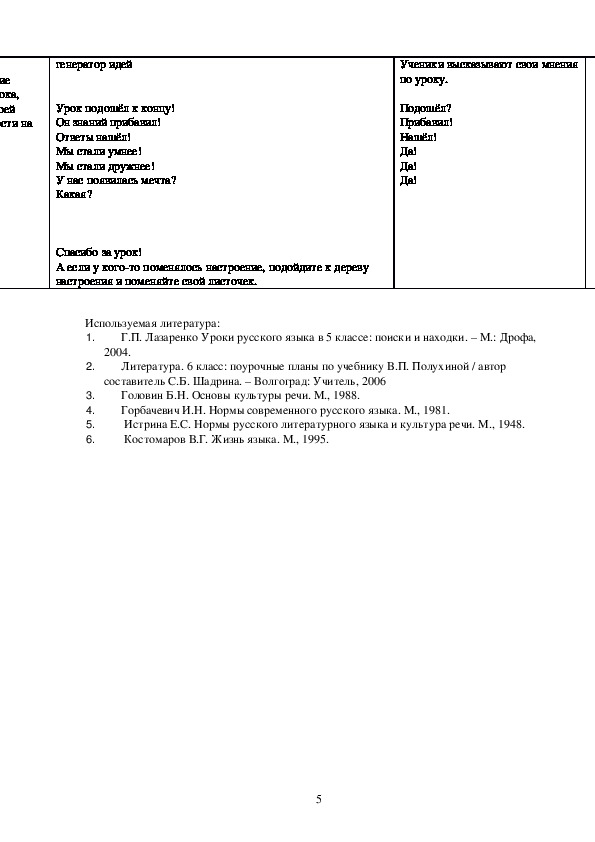 Г.П. Лазаренко Уроки русского языка в 5 классе: поиски и находки. – М.: Дрофа,