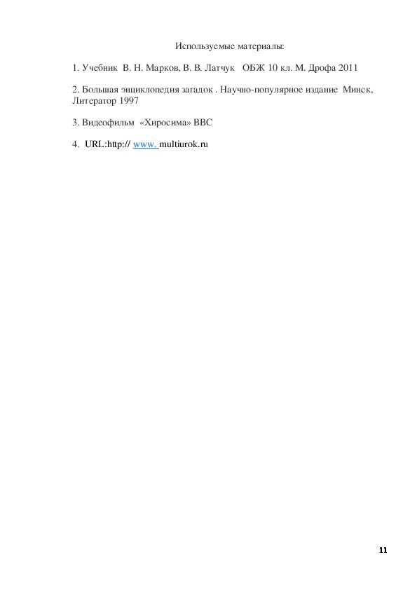 1. Учебник В. Н. Марков, В. В. Латчук ОБЖ 10 кл. М. Дрофа 2011