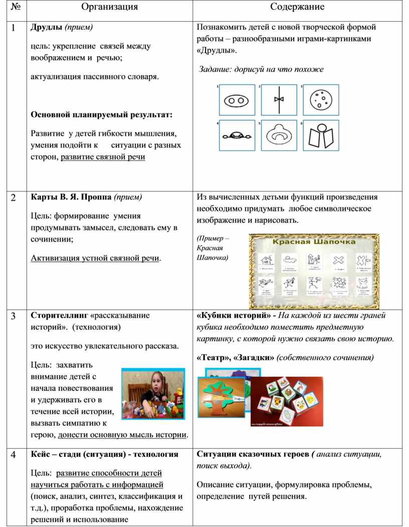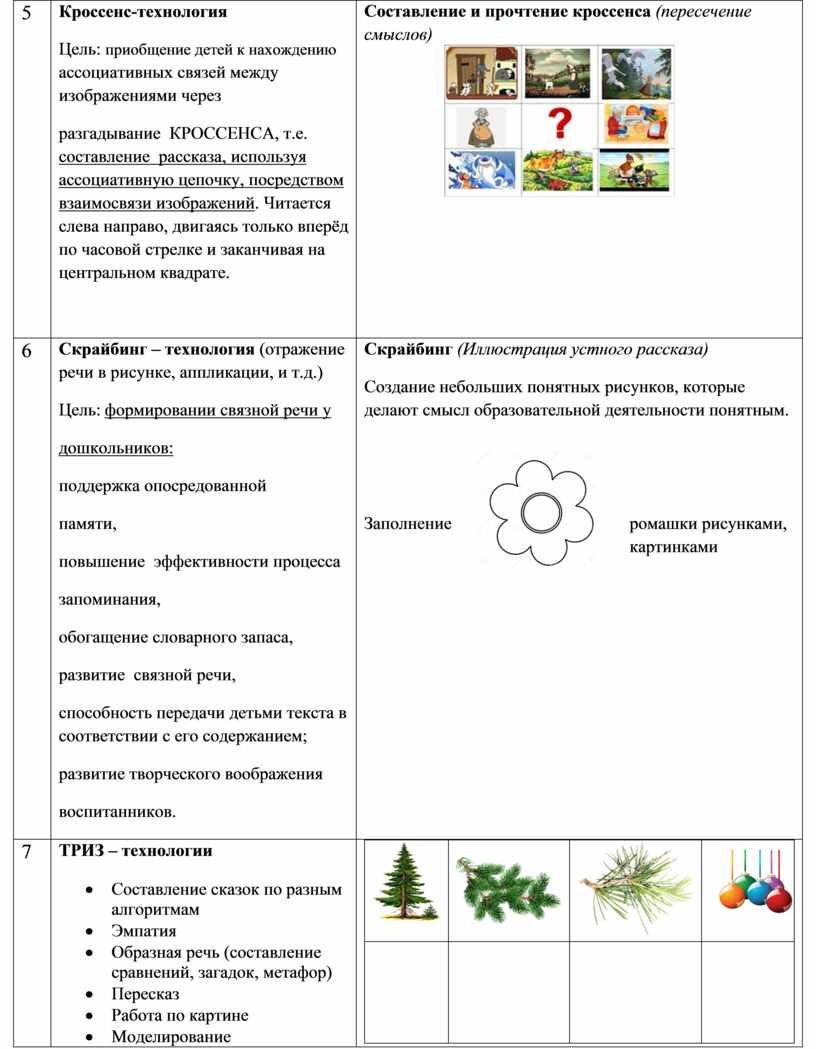 ТРИЗ – технологии · Составление сказок по разным алгоритмам · Эмпатия · Образная речь (составление сравнений, загадок, метафор) · Пересказ · Работа по картине · Моделирование Цель: позволяет детям легко запомнить информацию и применять её в практической деятельности. Мнемотехника (мнемотаблицы)