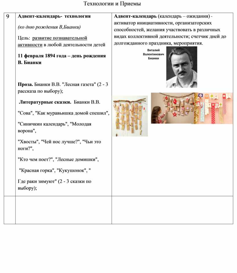 Адвент-календарь- технология (ко дню рождения В,Бианки) Цель: развитие познавательной активности в любой деятельности детей 11 февраля 1894 года – день рождения В. Бианки