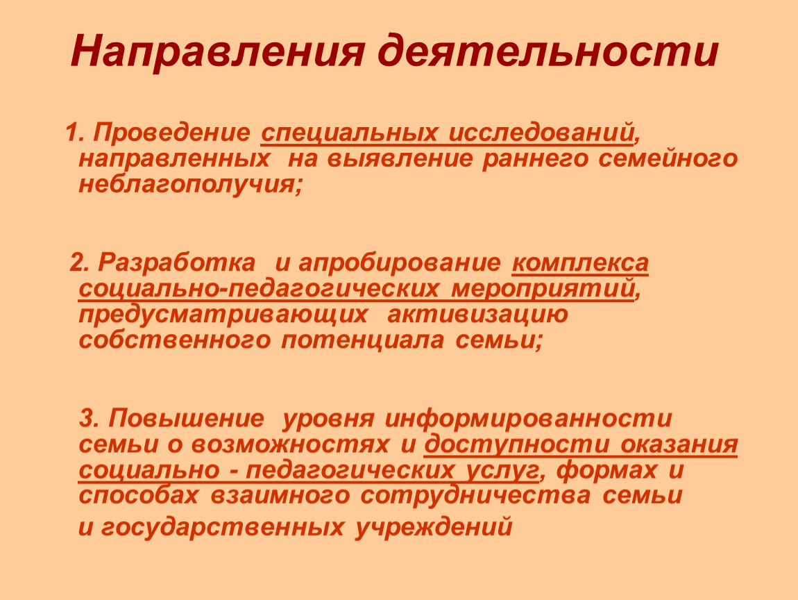 1. Проведение специальных исследований, направленных на выявление раннего семейного неблагополучия;