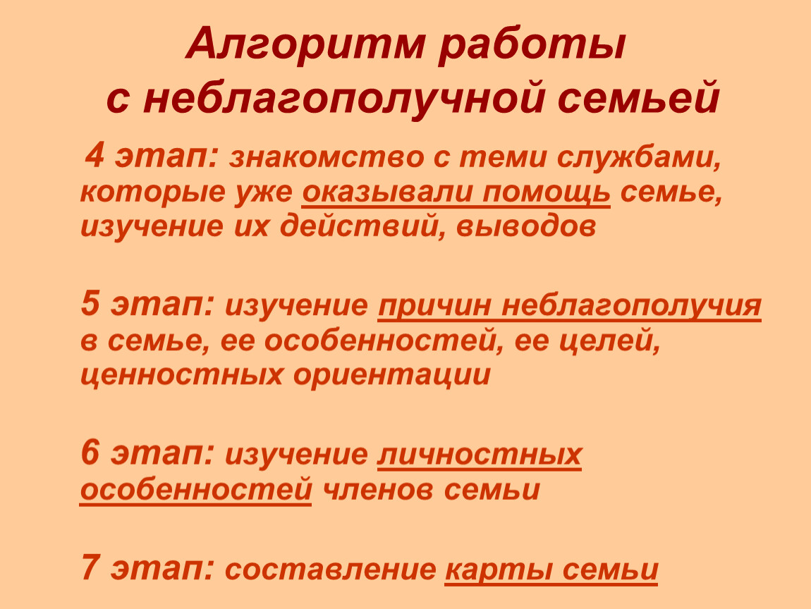 4 этап: знакомство с теми службами, которые уже оказывали помощь семье, изучение их действий, выводов