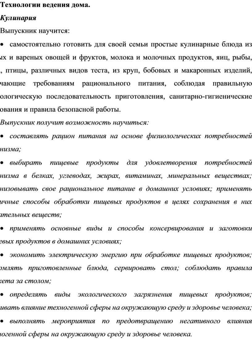 · самостоятельно готовить для своей семьи простые кулинарные блюда из сырых и вареных овощей и фруктов, молока и молочных продуктов, яиц, рыбы, мяса, птицы, различных видов теста, из круп, бобовых и макаронных изделий, отвечающие требованиям рационального питания, соблюдая правильную технологическую последовательность приготовления, санитарно-гигиенические требования и правила безопасной работы.