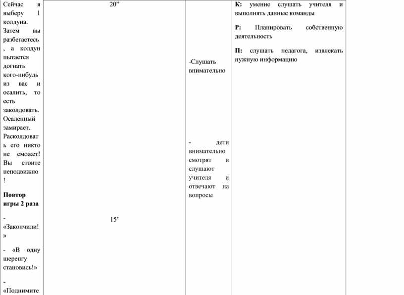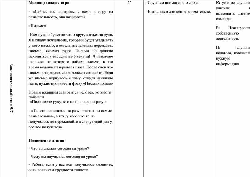 К: умение слушать учителя и выполнять данные команды Р: Планировать собственную деятельность П: слушать педагога, извлекать нужную информацию |