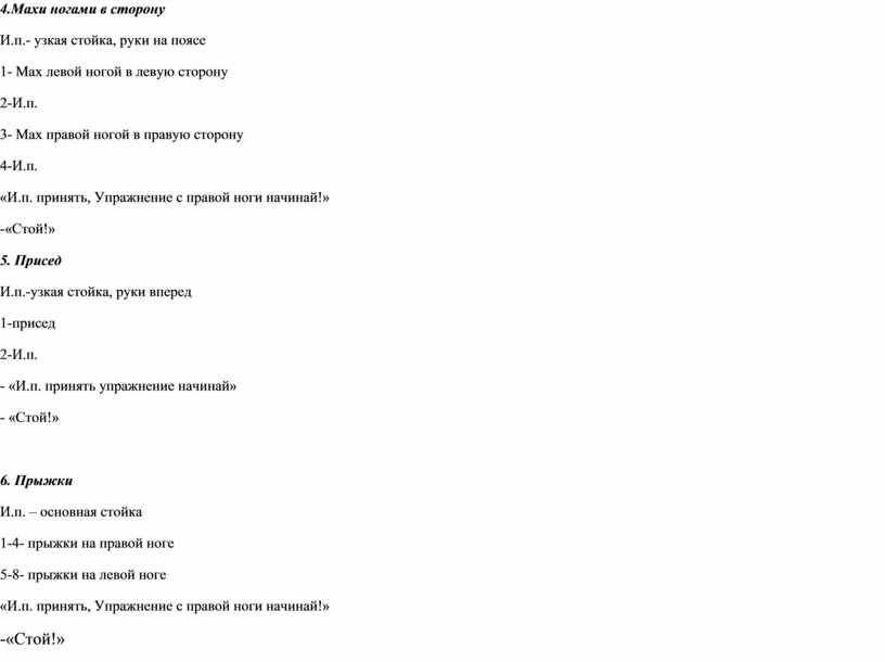 4.Махи ногами в сторону И.п.- узкая стойка, руки на поясе 1- Мах левой ногой в левую сторону 2-И.п. 3- Мах правой ногой в правую сторону 4-И.п. «И.п. принять, Упражнение с правой ноги начинай!» -«Стой!» 5. Присед И.п.-узкая стойка, руки вперед 1-присед 2-И.п. - «И.п. принять упражнение начинай» - «Стой!»