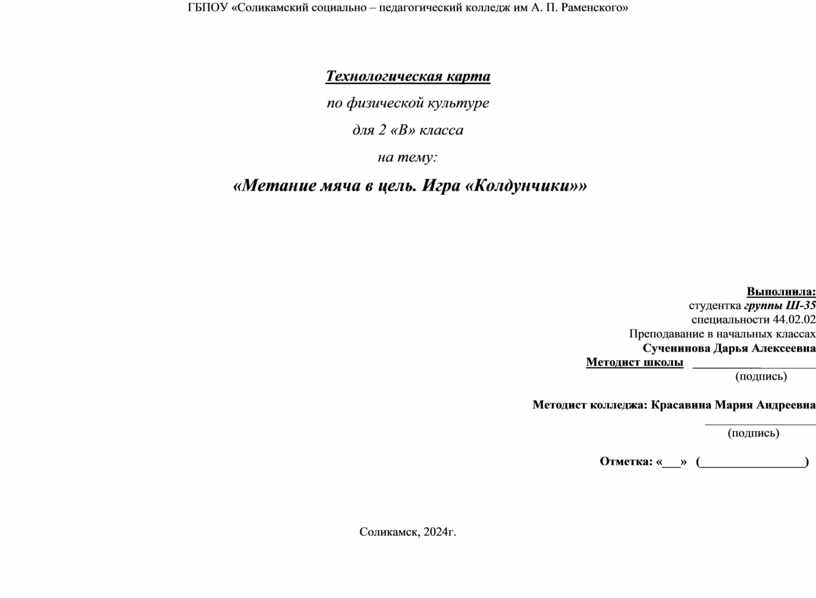 2.СТИЦ Построение - «По порядку номеров рассчитайсь!» Сообщение темы и цели урока - «Здравствуйте дети! - «Меня зовут Дарья Алексеевна, сегодня я проведу у вас урок физкультуры» - «На уроке мы с вами повторим метание мяча в цель, а так-же поиграем в игру «Колдунчики».