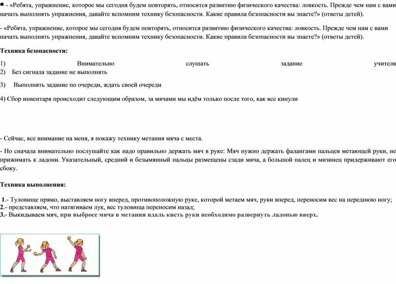 - «Ребята, упражнение, которое мы сегодня будем повторять, относится развитию физического качества: ловкость. Прежде чем нам с вами начать выполнять упражнения, давайте вспомним технику безопасности. Какие правила безопасности вы знаете?» (ответы детей). Техника безопасности: 1)