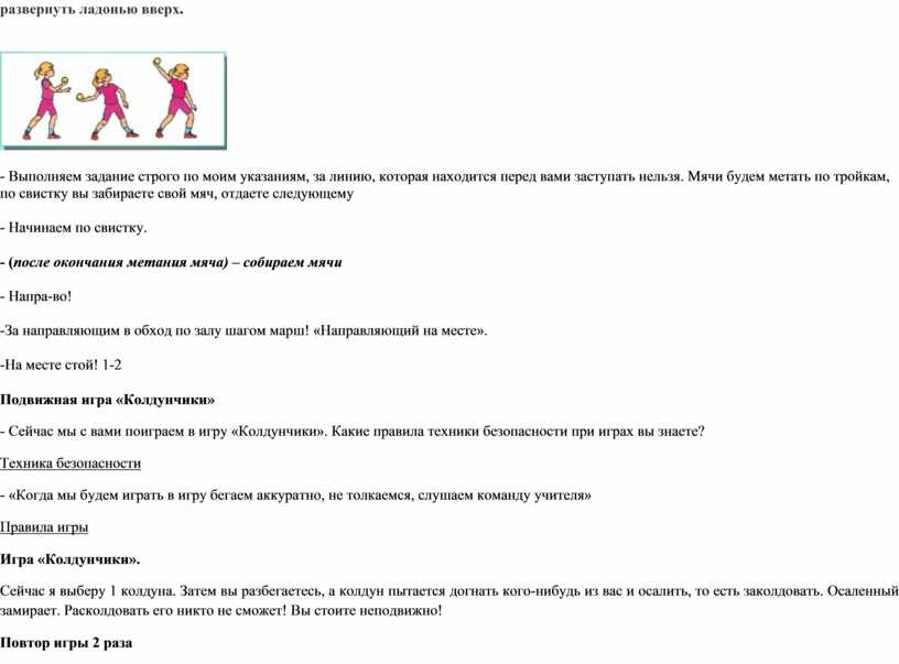 - Выполняем задание строго по моим указаниям, за линию, которая находится перед вами заступать нельзя. Мячи будем метать по тройкам, по свистку вы забираете свой мяч, отдаете следующему - Начинаем по свистку. - (после окончания метания мяча) – собираем мячи - Напра-во! -За направляющим в обход по залу шагом марш! «Направляющий на месте». -На месте стой! 1-2 Подвижная игра «Колдунчики» - Сейчас мы с вами поиграем в игру «Колдунчики». Какие правила техники безопасности при играх вы знаете? Техника безопасности - «Когда мы будем играть в игру бегаем аккуратно, не толкаемся, слушаем команду учителя» Правила игры Игра «Колдунчики». Сейчас я выберу 1 колдуна. Затем вы разбегаетесь, а колдун пытается догнать кого-нибудь из вас и осалить, то есть заколдовать. Осаленный замирает. Расколдовать его никто не сможет! Вы стоите неподвижно! Повтор игры 2 раза - «Закончили!» - «В одну шеренгу становись!» - «Поднимите руку, те кто не выбыл из игры» - «Молодцы, опустите. «Поднимите руку, те кто выбыл из игры только 1 раз» -Молодцы, вы были самыми внимательными»