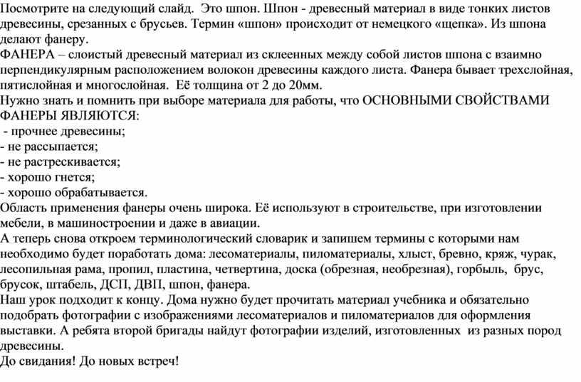 Наш урок подходит к концу. Дома нужно будет прочитать материал учебника и обязательно подобрать фотографии с изображениями лесоматериалов и пиломатериалов для оформления выставки. А ребята второй бригады найдут фотографии изделий, изготовленных из разных пород древесины.