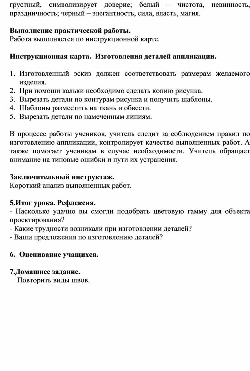 Цель: Развить познавательную активность учеников, самостоятельность мышления, логическое мышление, умение анализировать. Научить выполнять технологические требования по изготовлению шаблонов и деталей аппликации. Расширить знания о значении цвета в создании кампазиции. Воспитать художественный вкус, старательность, аккуратность.